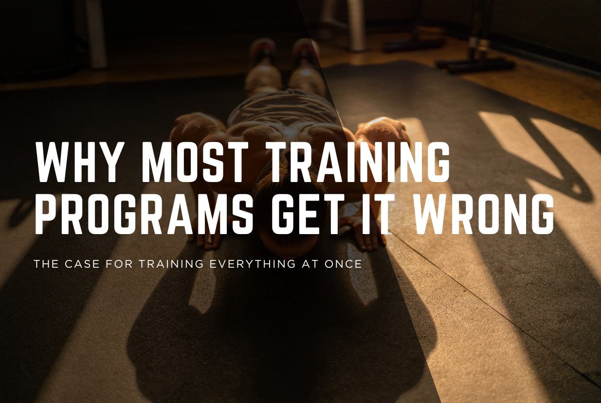 This is the opposite of how most programs are designed. Most programs dedicate entire sessions (or even entire weeks) to one quality at a time. Monday is chest day. Tuesday is cardio. Legs on Thursday. You know the drill.